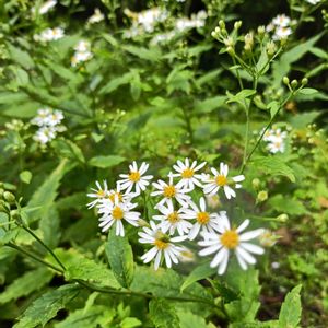 花友さんのノギクを調べているうちにこのお花の名前に辿り着きました まだ蕾の写真だけで申し訳ありません 🏷️のんびり 🏷️白い水曜日♡ に参加させていただきます 撮影は10/13日 シロヨメナ(白嫁菜) キク科シオン属の多年草 別名 ヤマシロギク 本州〜九州の林縁などに生える 高さ30〜100cm 茎は直立〜斜上し分枝する 葉は長楕円形状披針形1/3辺りで急に狭くなり くびれてやや翼状になり(②) 3脈が目立つ 粗い鋸歯がある 花期 8〜11月 花は白色 総苞は筒形で総苞片は3列