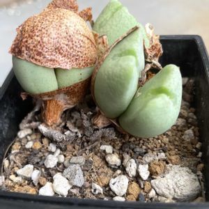 コノフィツム「向陽門」。2024年に購入。 なんと、コノちゃんが脱皮してる! え、この時期なの?? ————— Conophytum ハマミズナ科コノフィツム属 多年草、多肉植物(女仙) アフリカ南部(南アフリカ、ナミビア南部)原産