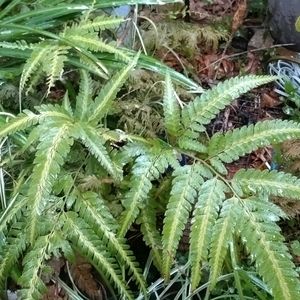 🍀斑入りハカタシダ🍀 寒いけど昨日からの雨でイキイキしています。 葉っぱの模様が博多帯に似てるからハカタシダだそうです。 🏷毎月4日はシダの日 🏷斑入り見つけ隊♪(12番) 🏷放ったらかし隊 に参加させて下さいね。
