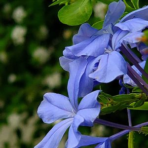 💙💜花壇の草花💜💙 ①蝶豆(ちょうまめ) マメ科 別名 バタフライピー 🌀つる性の 一日花 花の青にはアントシアニンという 天然の色素が含まれる ②カッコウアザミ キク科 別名 アゲラタム アザミに似たふんわりとした姿で 小さな筒状花が多数集まって咲く ③④花虎の尾 シソ科 別名 カクトラノオ 花穂は細長い四角錐で 花は四方に向かって規則正しく並ぶ ⑤ムラサキルエリア キツネノマゴ科 花径5cmほどの鮮やかなラッパ型