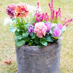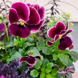 ✻✻秋の寄植え✻✻ パンジー ローブ・ドゥ・アントワネット を使って、寄植えにしました。 赤の濃いカルーナがアクセントに引き立ててくれました♪