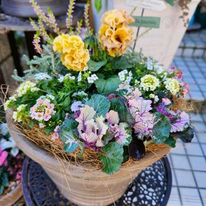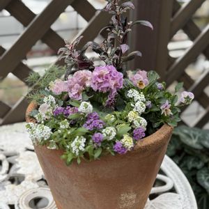 ロココのピンク系の1株使って寄せ植え作りました。 4枚目が未完成品、ここまで作って手持ちの苗では合うものがなくて翌日以降に持ち越し💦 レディを受け取りに行ってビオラ万葉菫を見つけて入れました。 手前には定番の隙間埋めのアリッサム、何か良い苗見つけたら入れ替えるかもしれません😅
