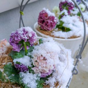 アントワネット様に雪が! ごめんねー スノードロップはもうすぐ咲きそうなのに雪の中です