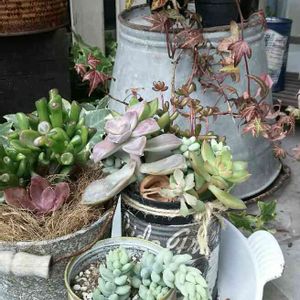 玄関ポーチ♡ヨーロッパのアンティークショップで買ったル・クルーゼの古いオーブン皿にリメ缶の多肉達をINしてます(*ノωノ)年中外!スパルタです(*´ノ∀`*)