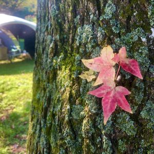 テントを張った真横の「モミジバフウ」の大木🌳 幹から可愛く幼葉を出していました、もう紅葉する❓😍💕