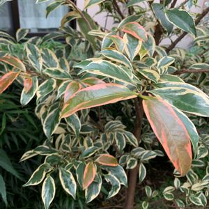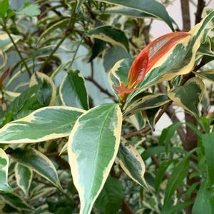 2020/7/7の投稿時、 ぷりぷりむら様から「斑入りサカキ(=フクリンサカキ)とご指摘頂いた樹を見に行きました 7/7には若芽だったオレンジ色の葉も大きくなったようです サカキの特徴に「若葉が巻いて鎌状になる」と書かれているものもあり、前回の写真はこの点でも合致するようです