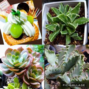 ↖️シャインマスカットのタルト(購入品) 今日はドラえもんと娘の誕生日ꉂꉂ😆 娘が選んだケーキ めっちゃ美味かったそう(✽´ཫ`✽) ↗️夏越し順調なフォーカリア 雪波 ちょっと増えてる♡ ↙️昨日の朝霞錦と一緒にうちに来た新入りスヨン 我が家の「多分スヨン?」と違って、なんて状態がいいんでしょう… ↘️こちらも絶好調のフォーカリア名無し(鯨波かな) 凶悪な牙が可愛すぎる!!