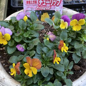 パンジーわらく3種植え✨チューリップの球根も忍ばせています🌷ダブルデッカー寄せ植えです☺