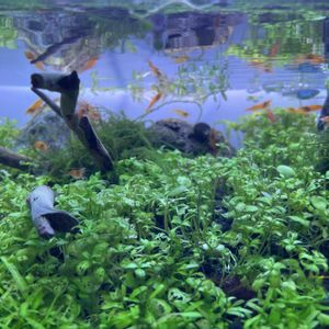 オレンジチェリーシュリンプ水槽に気が付いたら稚エビたくさん泳いでる。 そういえば抱卵してたエビいたなぁー🦐