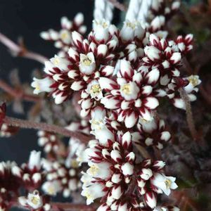 先っぽの白いポツポツはお花でしょうか。 やっと昨日雪囲い外しました。 そしてほとんどの多肉達は外の棚へ(^^)