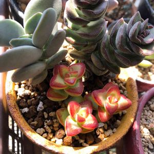 クラッスラ属 天狗の舞🌱 一昨年の10月にゆっこ♪さんから、昨年の4月にプーさんから、もらった子🤗🌱どれだけ生長したか、みどりのまとめで見てもらいたい(〃♥^♥〃キャャャア) この子たちもデッカいテラコッタの寄せ鉢の中ですくすく元気に殖えてくれて、めっちゃ色良く可愛くなってます🤩夏場にちょっとヘタレる子だけど、今年は木陰で暑さを凌いで欲しいなぁ😊🎶 「たっちんの天狗の舞」タブをタップでこの子の生長記録のみどりのまとめが簡単に見れます😊🎵 「多肉ラボ©」参加のお申し込みは、1/17のブロンズ姫の投稿からお願いします🤗🌱