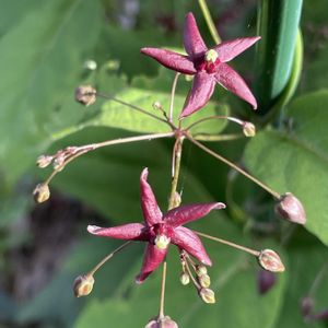 コバノカモメヅル(小葉の鴎蔓 )キョウチクトウ科(旧分類ではガガイモ科)カモメヅル属 湿地公園でたくさん咲いてたコバノカモメヅル。 昨年から湿地の状態が悪く、今年は見ることできませんでした。 昨日湿地公園の外、道路沿いを観察していたら、コバノカモメヅルが咲いてました。 2ヶ所で他の草に絡んで咲いてました。 1cm弱の小さなお花ですが、花弁の先がクルリン、星型のお花が可愛いです。 今年も見れて良かったです。 茎に向かい合ってつく2枚の葉がカモメの翼のように見えることから、その名が付いたといわれています。 葉は3-11cmの長楕円形~披針形、先は鋭く尖り、基部は円形~浅い心形で柄に続きます。 葉腋から花柄を伸ばして小豆色の花を散房状に付けます。 花冠は径7-9mm。 花が終わると、長さ約5~7センチ、幅約7ミリの細長く先のとがった実をつけます。 熟すと割れて、白く長い綿毛が生えた種を散らします。 🏷 金曜日の蕾たち