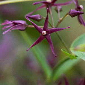 小葉鴎蔓(コバノカモメヅル) キョウチクトウ科カモメヅル属のつる性多年草。山野の林縁などに生える。葉は対生し、長さ3~11㎝、幅約2㎝の長楕円形、先は尖り基部は浅い心形~円形で短い柄がある。花期は7~8月。葉腋から花序を出し、直径7~9㎜の暗紅紫色の花をまばらにつける。花冠は5裂し、裂片は細い。副花冠は白いずい柱の半分ほどで、花冠と同色。果実は袋果。長さ5~7㎝の披針形で先は細く尖る。種子は狭倒卵形。平たく、縁は翼状。基部に白い毛(種髪)が多数つく。 名前は、花弁の中心部のずい柱が淡黄色で、ずい柱の周囲を取り巻く副花冠が濃暗紫褐色なことろが、背黒鴎(セグロカモメ)の目のアイリング(赤い輪)に似ているため鴎となり、仲間のシロバナカモメヅルの葉よりも小さいので小葉が付いた。また、対生する葉がカモメの飛翔を思わせるとの説もある。 出典『野に咲く花』『草木の種子と果実』『野草の名前』