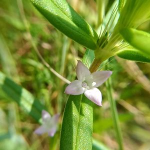 オオフタバムグラ(大双葉葎)アカネ科オオフタバムグラ属 湿地公園の外側に群生してます。 外来種ですがお花は可愛いんです。 4つの雄蕊、とくにピンクの雌蕊が可愛いです。 要注意外来生物なのでやっぱり増えてる感じです。 北アメリカ原産。東京で最初に見つかり、現在は各地に見られるが、あまり多くない。海岸や河原の乾いた砂地に生え、高さ10〜50cmになる。葉は対生し、長さ1〜3.5cm、幅が2〜4mmの線状披針形で、先端は刺状に短くとがる。葉の表面にはかたくて短い毛があってざらつき、とくに葉の縁の毛は刺状でざらざらする。托葉は左右2個が合着し、上部は刺状の毛があって目立つ。葉腋に白色または淡紅色の小さな花を2〜4個ずつつける。花冠は長さ4〜6mmの筒状で、4裂する。果実は乾果で、長さ3〜4mmの倒卵形。先端に萼が残る。花期は7〜8月。