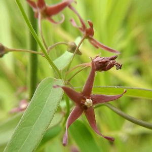コバノカモメヅル(小葉の鴎蔓 )キョウチクトウ科(旧分類ではガガイモ科)カモメヅル属 湿地公園でたくさん咲いてたコバノカモメヅル。 昨年から湿地の状態が悪く、今年は見ることできませんでした。 昨日湿地公園の外、道路沿いを観察していたら、コバノカモメヅルが咲いてました。 2ヶ所で他の草に絡んで咲いてました。 1cm弱の小さなお花ですが、花弁の先がクルリン、星型のお花が可愛いです。 今年も見れて良かったです。 茎に向かい合ってつく2枚の葉がカモメの翼のように見えることから、その名が付いたといわれています。 葉は3-11cmの長楕円形~披針形、先は鋭く尖り、基部は円形~浅い心形で柄に続きます。 葉腋から花柄を伸ばして小豆色の花を散房状に付けます。 花冠は径7-9mm。 花が終わると、長さ約5~7センチ、幅約7ミリの細長く先のとがった実をつけます。 熟すと割れて、白く長い綿毛が生えた種を散らします。 🏷 金曜日の蕾たち