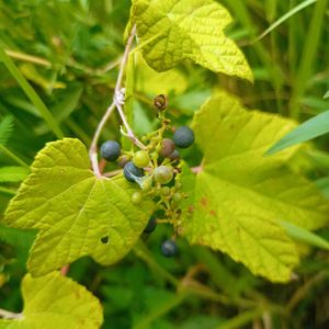 エビヅル(海老蔓)ブドウ科ブドウ属 エビツルの果実、はじめまして。 綺麗な色、思ったより大きな実でした。 9月7日 葉っぱも可愛いんです。 和名の由来は若葉の裏面に白色~淡紅褐色の毛が密生し、エビの色に似ていることから。 葉は長さ、幅5~15㎝、3~5裂し、有柄。葉裏には白色~淡褐色のクモ毛が密生する。 巻きひげは葉と対生する。 雌雄異株。円錐花序に多数の花がつく。 雌花(両性花)、雄花とも黄緑色。 果実は直径5~6㎜、黒く熟すと、甘酸っぱく食べられる。 🏷 水曜日は水色 🏷 8日は葉っぱの発表会