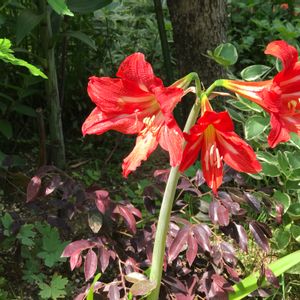なんとか揃って咲いたガーデンアマリリス😆 左側に遅れてニョキニョキしてきたのは、白花かな❣️