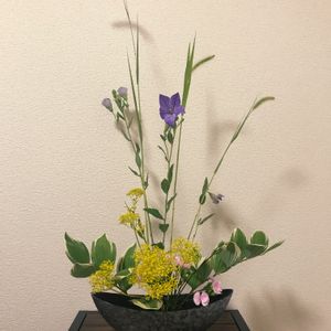 教室による花材。桔梗と猫じゃらしを中心に秋らしく縦の流れを作ってみたものの今回の花材には苦戦。スプレーカーネーションの使い方が毎回難しい。