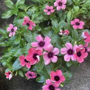 ビンカ (日々草)「モネ♪」 8号鉢 (直径24cm)に3株植え です。 モネには2種類の色があり 花弁が濃色タイプと薄色タイプ… この微妙に色の違う 2種を混ぜて植え込んでみました♪