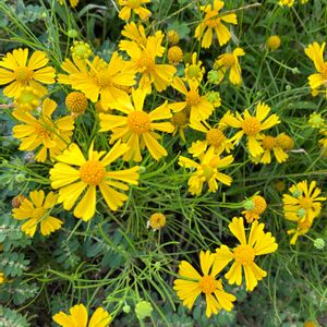 ① 昔から実家にもあるヘレニウム✨ダンゴギクとも言いますね🤭うどん粉病に掛かるほど密生していたので ポットに避けたのですが根が残っていたようです🧡 ② こぼれ種のタンジー💛香りがあまり好きではないのですが… 葉っぱ🌿やお花は可愛い😊