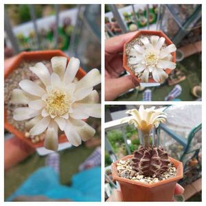🌵公園から連れ帰った牡丹玉(右奥)が植替えても肥料をあげても、どーにも微動だにしないので、欲張って少し大きめのギムノを探していました👓 時間調整という言い訳でついつい寄ってしまうお花屋さんは、このご時世で多肉の入荷が激減してましたが、1ヶ月ほど前、イメージしてた大きさで800円→500円に値下がりしてるのを棚隅に発見💡✨ 家に帰ってから微かな花芽に気付いて、かなり得した気分で見守ってましたが…いよいよ〜😆🎶