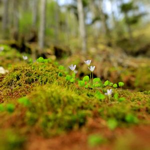 コミヤマカタバミ② 新緑のカラマツ林の斜面にある 苔生した倒木の上に咲いていました。