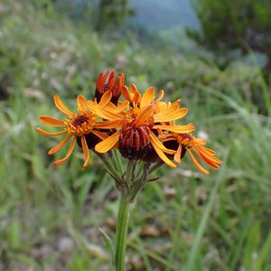 コウリンカ キク科 花は、直径3cmくらいです。 鮮やかなオレンジ色で、咲き始めの様子でした。(①) 茎に少しだけ綿毛があります。(①③④) 葉は、互生で、倒披針形。基部は茎を抱いていました。(④) この、花びら、垂れ下がるほど、後ろにそりかえるそうです。(②) まだ咲き始めだったので、その姿は、見ることができませんでした。 7.1