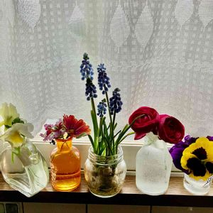 キッチンの窓辺が賑やかに😊 久しぶりの雨☂️ お花を少しカットしました♪