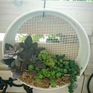 これも土曜日に寄せ植えした物 100均の粉ふるいに色を塗って寄せ植えしました🎵 チキンネットが無く凄~く苦労して土を入れる部分を針がねを通して作ったお気に入り😄💕 なのになのに旦那の一言 「これで完成?」 そうですこれで完成品ですが❗❗❗😡 😡😡