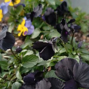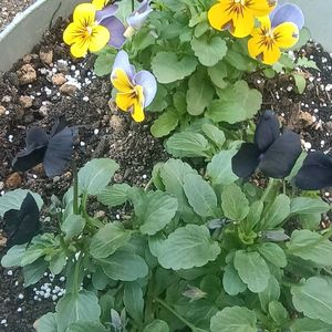 🍀おはようございます🍀 ユニークカラービオラ 名前はブラックデライト🖤 ブラックさん🖤初めての仲間入り😊 昨年も迎えたビオラ イエローブルージャンプアップ🩵💛とコラボ💕 こぼれ種からのノースポールを 5つ入れました😀 ③④大好きな小菊 実際は写真よりも茶系の小菊… 黄色い種まきジニアがまだ 頑張っています😄 ⑤ユニークカラービオラ ももか びーこん2苗は 地植えにしました(◕ᴗ◕✿)
