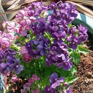 🍀おはようございます🍀 宿根ネメシア アレンジシリーズ❣️ 🩷💜が可愛いです😊 ②プリムラ マラコイデス ローズ💗 暖かくなり一気に開いてきました♬ ③ユニークカラー ビオラ ももかびーこん❣️ ④地植えの薔薇たちの新芽🌱も 少しずつ大きくなりました♬ ⑤こぼれ種からのビオラたちも やっとお花がチラホラと 咲き始めてきました♬