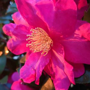 夕陽に染まる山茶花 職場から駅までの間にある大きな団地内の生垣として、サザンカが沢山植わっています。 今日は少し早めの退勤で、いい感じに夕陽が当たっていましたぁ✨