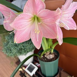 こんにちは🥰 2年目マジックアマリリスが開花しました🙌🙌🙌👏👏👏🩷🩷 綺麗で可愛い😍😍🩷🩷 もう一つのツボミも開花しそうです! ただ、今年は葉が早くから元気に伸びているので、花芽はそれを避けながらで、少し気の毒です🤭🥹 しばらくは楽しめるので嬉しい🥰