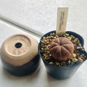 にょほほ〜🤣 植え替えしちゃおっと🤣 発根管理中の札落ちパキポの たぶんベンセを 黄おじが作った鉢へドーン💥