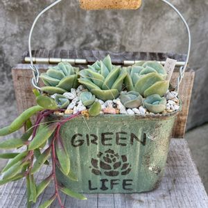 おはようございます(*´︶`*) 久しぶりにリメ缶づくりをして ちび苗ばかりで寄せ植えしました🌱 スパム缶は初めてです✨ ちょうど良い大きさなので また作りたいです⋆*✩⑅◡̈⃝* 塗料は ・カインズのザラザラベース ・ダイソーの防カビ水性塗料 (色はミリタリグリーン) 針金&コルクを付けて 最後にステンシルを入れました! このミリタリーグリーン、 とっても気に入りました🧡 リメ鉢も作ったので またお気に入りの多肉さんを植えたら 写真を撮りたいと思います♪♪ 根っこがないちび苗さん達が 元気に生長してくれますように➰
