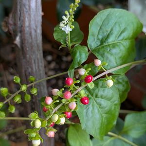 庭の暑さに負けない元気なお花✨③ 可愛い実が色づいてきました💘 白い小さなお花も一緒に見られます🙂 (花弁はなく白い部分はガク片です) ヤマゴボウ科 リヴィナ属 花期 6〜10月 原産地 北米南部から南米
