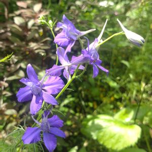 雨☔風🌀に負けて?倒れたり曲がったりの庭のチドリソウ(千鳥草)です 蕾も咲き始めも好きです💕 1つの花をよ〜く見ると面白い形のお花です😊 キンポウゲ科 チドリソウ属 花期 5〜6月 原産地 南ヨーロッパ