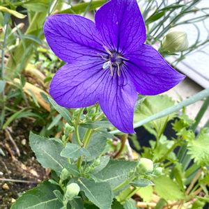 ☆庭のお花達☆ *キキョウ 地面、スレスレ位お行儀悪く 茎が伸び、その先にお花が 咲き始めました〜 未だかたくきれいなグリーンの蕾も もうすぐ弾けそうなぷっくりと 花の色か薄っすらわかる蕾も可愛いです〜😍