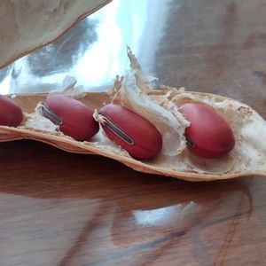 赤刀豆(アカナタマメ) 一昨年、熟した莢ごといただいたもの 置いておいたら、いつの間にか割れて、中の豆が出てきた👀!! 赤くてきれいな、大きいお豆です 2枚目に大きさがわかるものを置いています 大きいものだと60センチ!にもなるそうなので、これは小さい方かも 草丈も5メートル以上と、最大級のマメだそう😲 熱帯アジアや熱帯アフリカが原産と言われていて、「ジャックと豆の木」のモデルになったとも🧑🌾