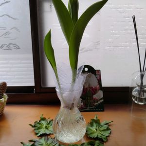 玄関の下駄箱の上に🤗 水耕栽培の🌷🌷チューリップ🌷 アイスクリーム🍨 やっと花目が上がってきました🥰 周りに置いたのはクリスマスローズのガクです〜ちょこっとコースターみたいです😊