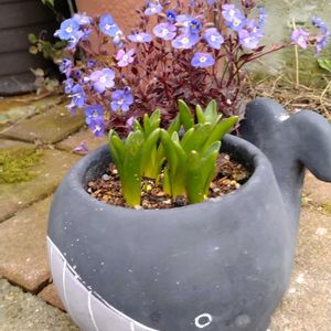 芽🌱が出たのが嬉しくて🤗 今日は多数投稿🙇 ①クジラ🐳に入れたムスカリ💙 ➁🟡セツブンソウ ③🤍去年植えたヒヤシンス ④🟡福寿草