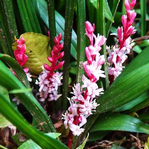 キチジョウソウ(吉祥草) キジカクシ科キチジョウソウ属 緑地公園に植えられていて 今、咲いてきました💕 花序の上の方は雄花が多く 花序の下の方に両性花が付きます 濃いピンクの柱頭が見えています💕 前年の実が赤くなって残っているはずですが、見つかりません 開花が遅かったですが花は沢山咲きました💕 今年の花が多いから来年は実を期待しましょう🔴😊🎶