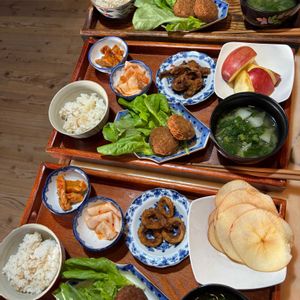 朝ごはん 菊池米 味噌汁、蕪の葉 蕪千枚キムチ エリンギキムチ イカリング揚げ コロッケ、サラダ菜 リンゴスライス 姉が、リンゴも硬いと言うから、スライスしてみた。
