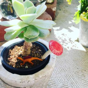 先日購入した大きいエケベリアの名前が違っていました💦 正しくは「ポルックス」、ポールックじゃなかったです(^_^;) ポルックスを大きい鉢に植え替え。 大きいから存在感が凄い😆 左斜め上のグリーンのルシータが外葉が枯れてちょっと小さくなってるのに今日気付いて 土の配合を保水性が高い花の土多めに変更して水もあげました。 ポルックスも同じく変更。 葉が薄い多肉は萎れやすいですね(> <;)