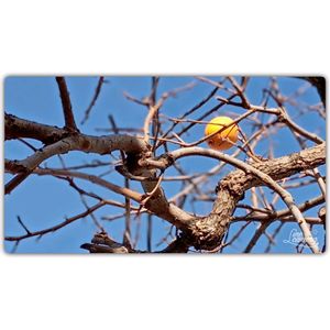 【木守柿】 冬晴れの青空に ぽつんと 残した熟し柿は 古よりの慣わし 来年もまた豊かに実る事を 願って、鳥と、神に捧げる 神と人とが共に分かち合う 「尊敬と祈り」のかたち 共に生きる喜びを思い出し 見る人の心に明るい火を灯す という 魅せられて…。 俳句では 「木守柿」は秋の季語 「木守り」は冬の季語という まつわるエピソードをひとつ 「千利休」は晩年 長次郎作の茶碗を弟子に それぞれ選ばせて譲り 最後に残ったひとつの赤楽茶碗を 【木守】と名付けて 長く愛用したという。 「歳時記より~」