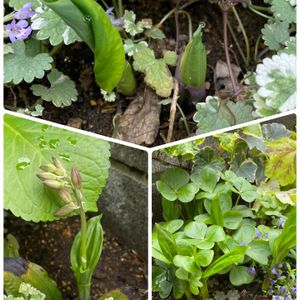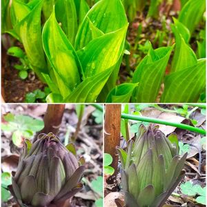 芽吹き時なんですね✨ ニ年目のカサブランカから大きな芽が出ていました❣️ ギボウシは株分けしようと思っているうちに 勢いのある新芽が出てきています💦