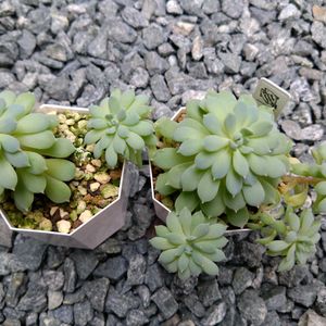 こんばんは😄 昨夜の暴風雨も凄かったですね☔ 我が家の多肉達ヤバいくらい濡れまくってますが元気です😂 ちょこん、右は自分で買った子、左はお友達のJUSHIちゃんに頂いた子💕 両方とも紅葉は醒めてしまったけれど大きくなってきました🙌 ちょこんは初めて育ててるのでまだ我が家の環境でどんな感じに育っていくのか分からないんですが😃 夏越しが難しいと教えてもらいました💦 たぶん片親がカトーさんかグロブローサだろうなと勝手に予想しております🤭 どちらかがもし親だとしても、交配に使うと強いから何とも分からないですが初めての夏越し頑張ってみます😆 夕波、この子もJUSHIちゃんから😊 だいぶ大きくなってきましたよ🙌 もう少しで2号鉢いっぱいの大きさだ😆 ストロベリーミルククラウン、この子は別のタニ友さんから頂いた子🩷 色が凄いでしょ🤣 雨に濡れまくって少しマシになりましたが別の葉挿しっ子はもっと凄くて🤣 この子本当に可愛く育つのだろうか😮💨 ハルビンゲリ、今日写真撮るのに探しまくって何とか見つけました🤣 やらかした時に植え付けた時の大きさ5mmだったんですが、今日久しぶりに見たら1cmあるかないかくらいに成長してくれてました😂 今年はちゃんと育ててあげなければ😰 エケベリアは5mmあれば根っこなくてもちゃんと復活しますから👍 私は何度も経験しておりますのでね🤭 皆様どれだけ小さくても諦めずお水あげ続けてあげてくださいね🤭