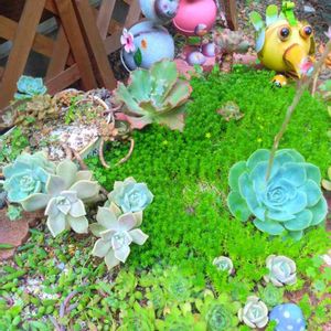 賑やかな多肉花壇✨ セダムに黄色いお花が咲いたよ💛 セダムの絨毯に囲まれて七福神さんも元気だよ~(*´▽`*)