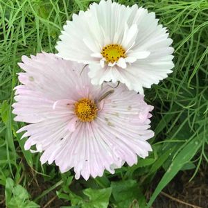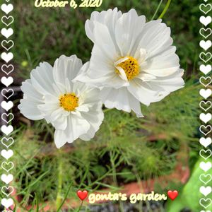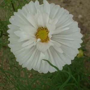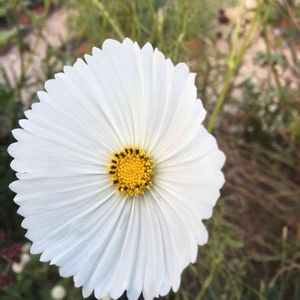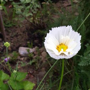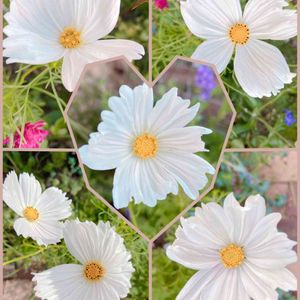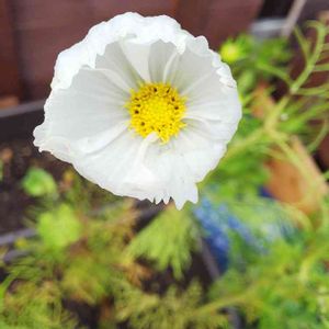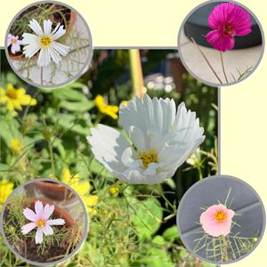 カップ咲きの可愛いコスモスカップケーキ(白)🧁の種をまいてみました。 やっとそれらしきもの(ちょっと違うけど😅)が咲きました♬ それまでに咲いたのは普通の形、ちょっと残念な形、色も白、薄いピンク、濃いピンクと何でもありでした😂
