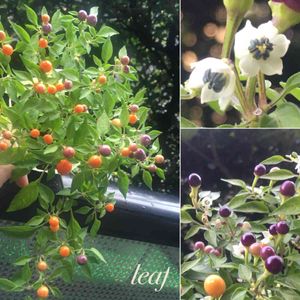 まるい実の 『観賞用トウガラシ』。 白にブルーグレーのシベの花が咲いた後は 小さな実を付ける。 淡い紫の実は濃い色になり、オレンジ色に 変わっていく。 オレンジが多くなってきた。 ブーケみたいで可愛いなー。
